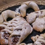 - Bıçakla üçgen şeklinde keselim. Üzerine elmalı iç karışımından koyup saralım.