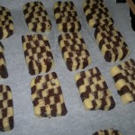 4. Bir vanilyalı bir kakaolu hamur olacak şekilde yan yana ve üst üste hamurları dizerken aralarına yumurta akı sürelim.
